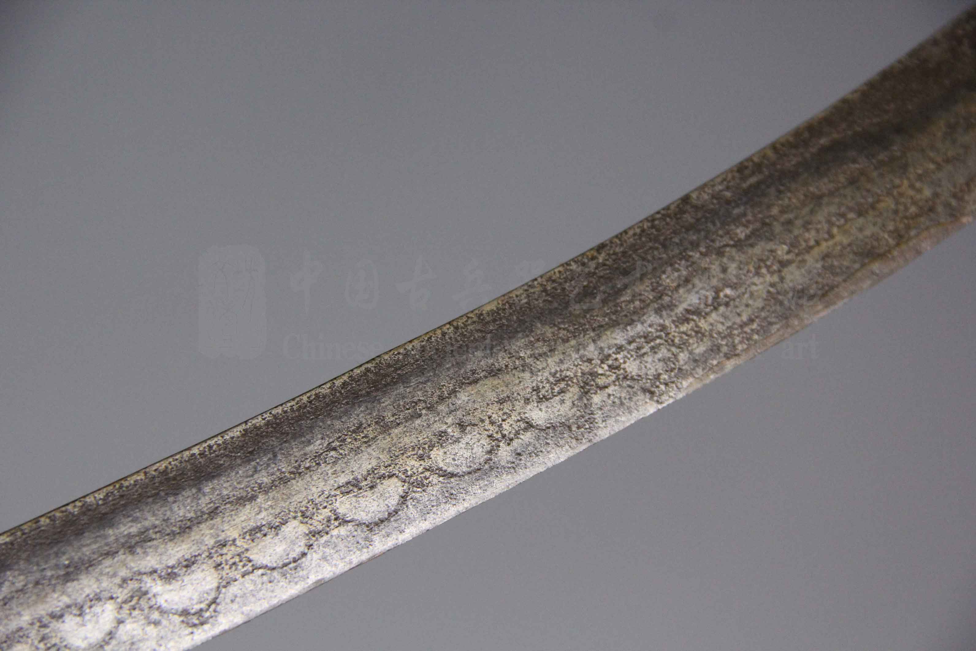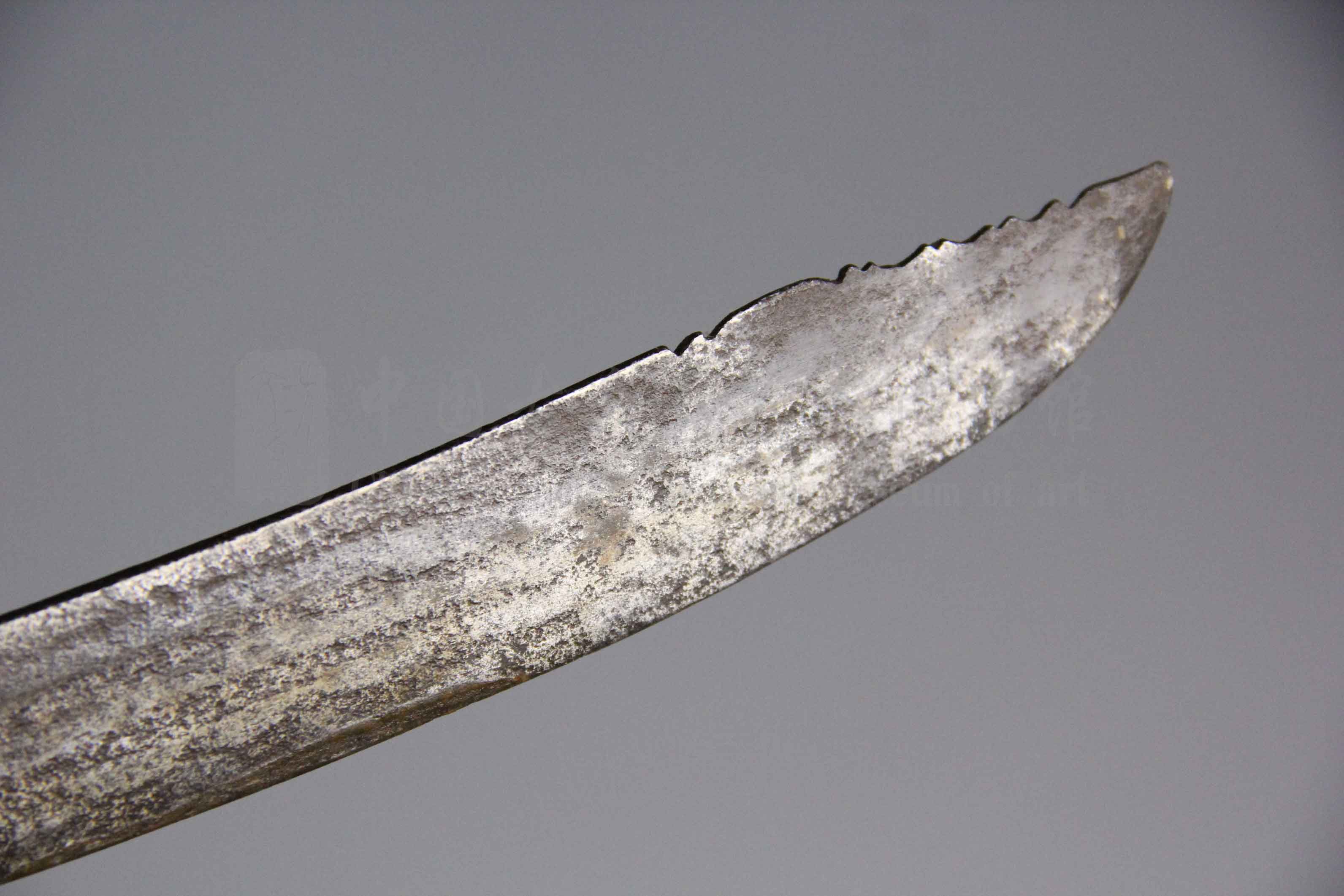 此刀由中国首家专业古兵器研究、修复机构——中国古兵器艺术博物馆(文涛坊)、锻造技艺第六代传人刘文涛老师,根据丰富古兵器修复经验,历时近五个月左右对此刀进行修复。刀形经调直、整形,更显精神。经简单研磨清理,马牙明显,露青白皮壳。