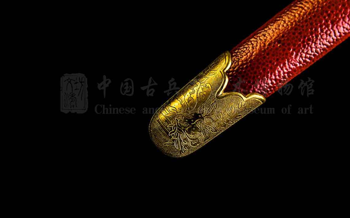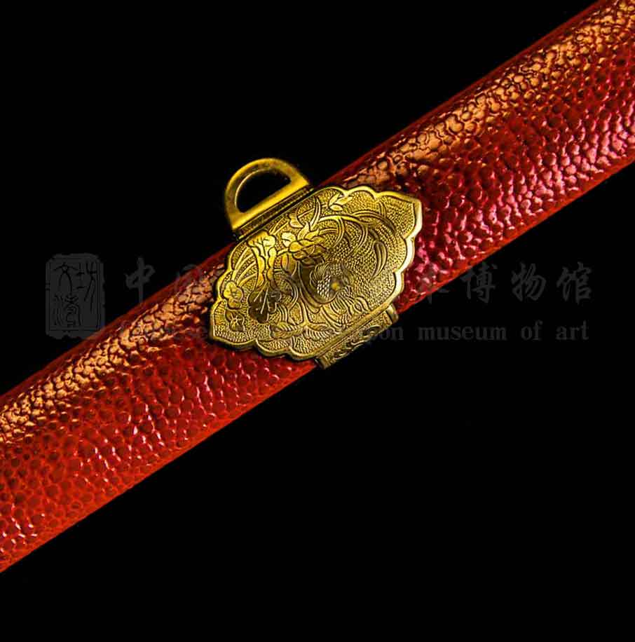 软木外包珍珠鱼皮做鞘,手工粘合,完美无缝对接。上朱红漆,喜庆吉祥。
