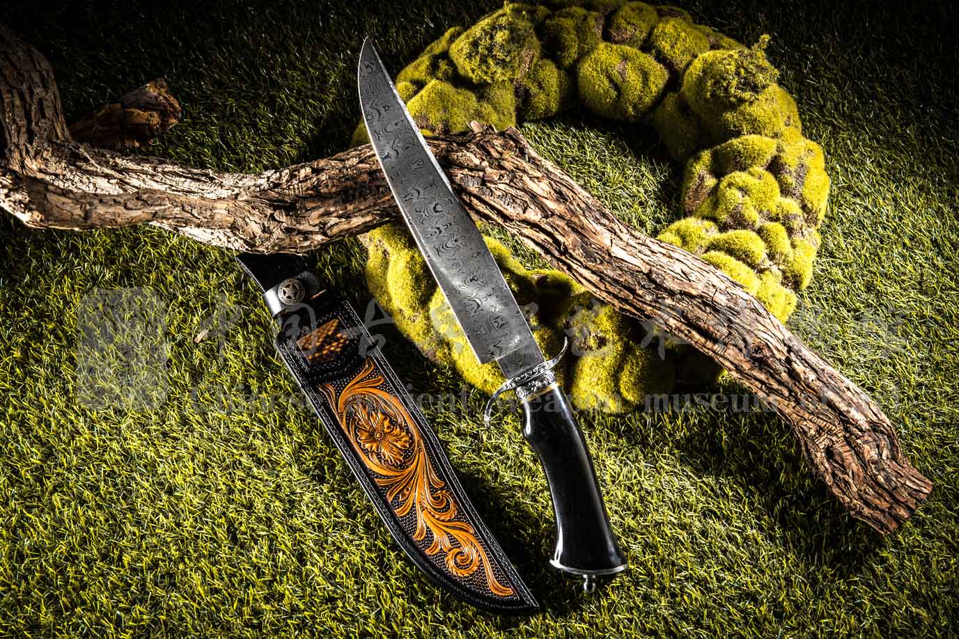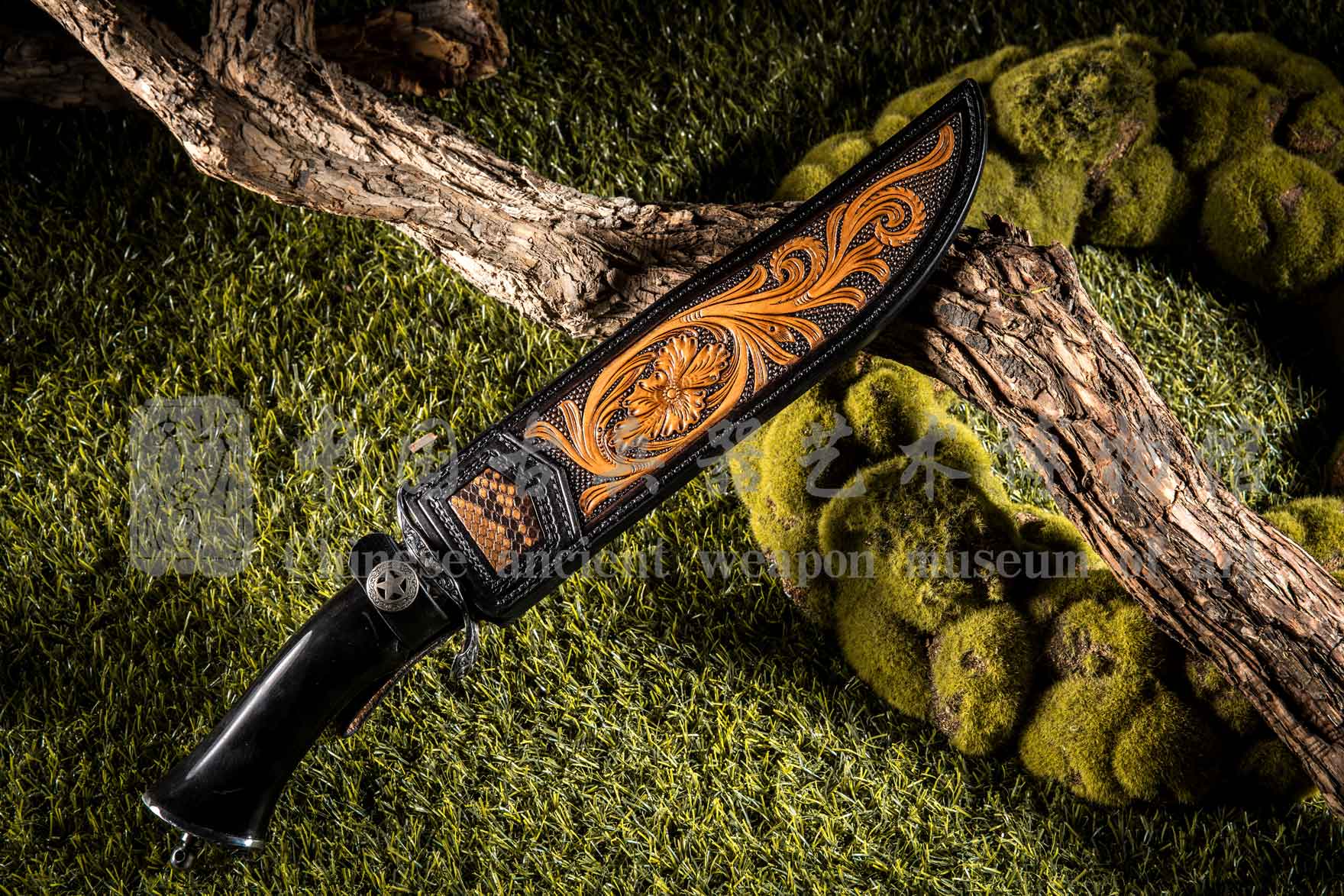 精选蛇皮与牛皮,手工缝制皮鞘。正面雕花,背部做编织纹,美观大气。