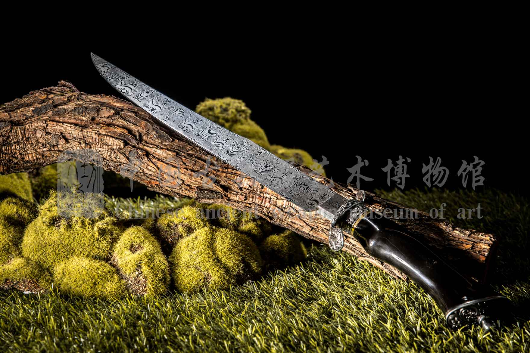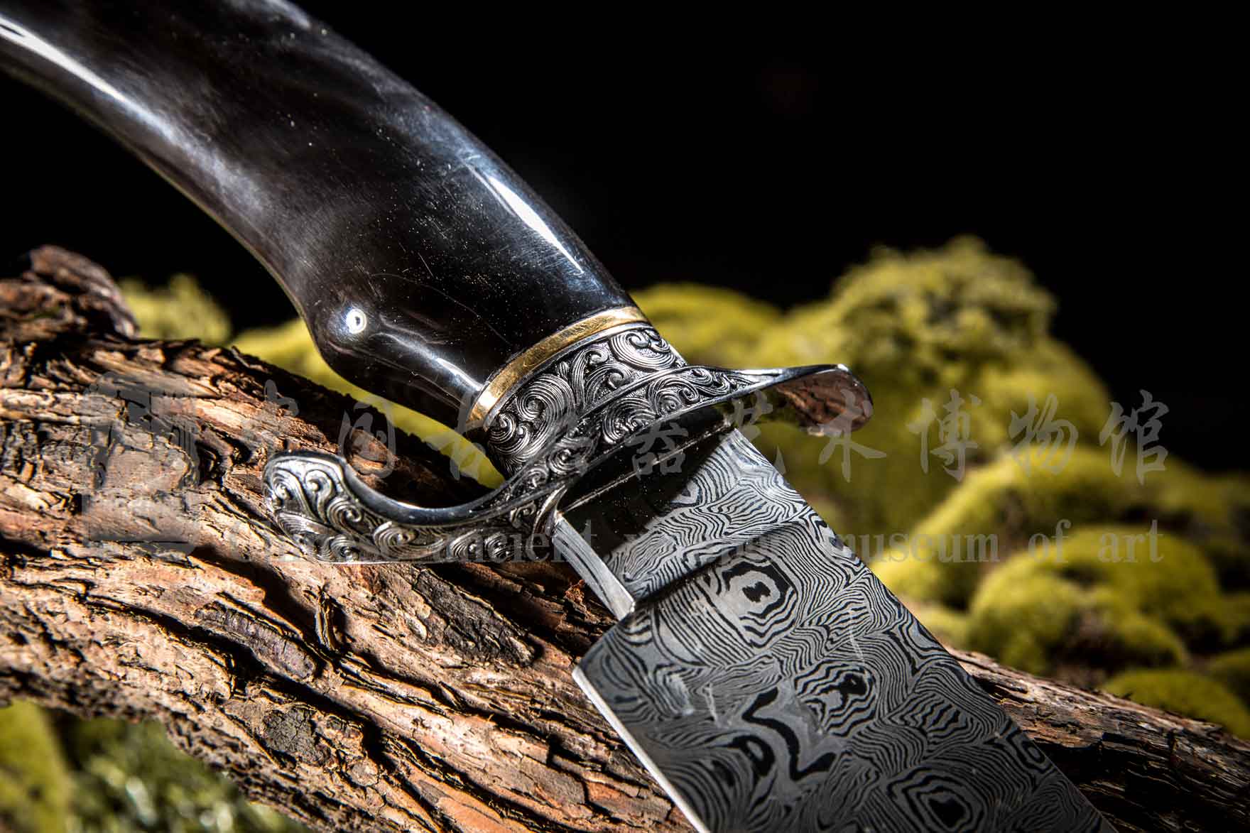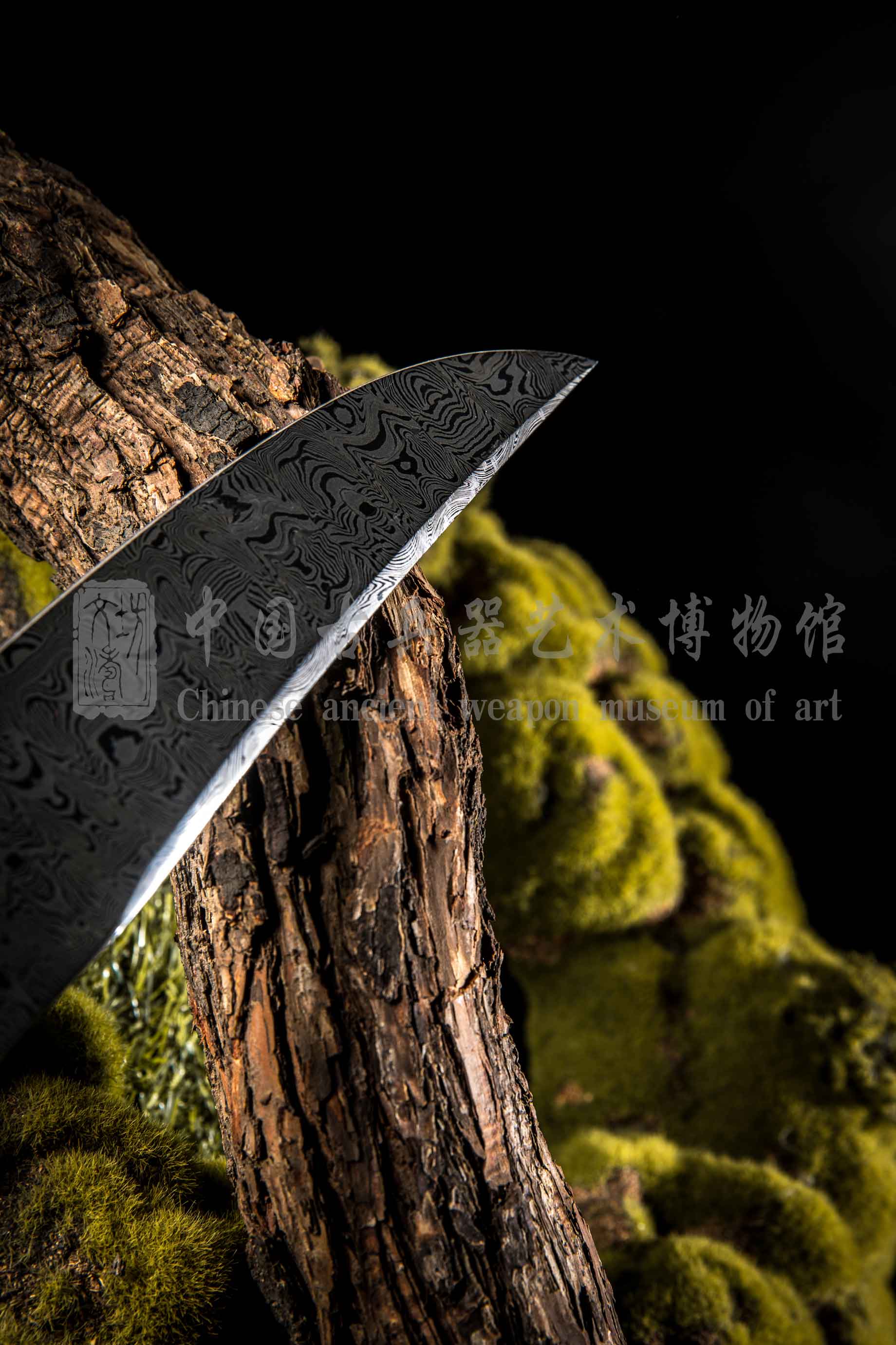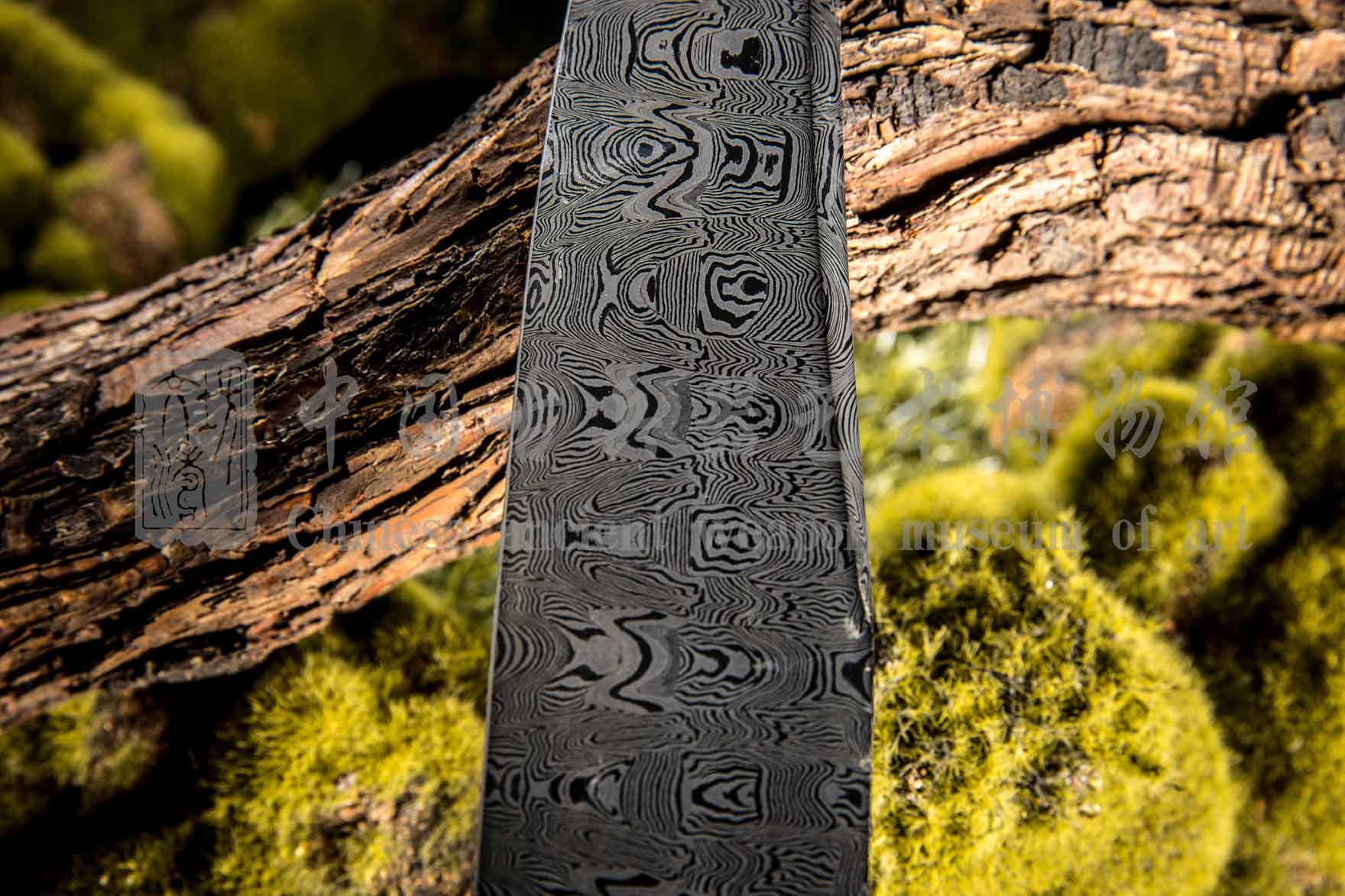 花纹钢天猫纹博伊刀由中国古兵器艺术博物馆馆长、锻造技艺第六代传人刘文涛老师,经过不断研究、破译、制作而成。此花纹钢天梯虽与古董刀剑天梯亦有差异,但也是文涛坊不断追寻、探索锻造技艺的又一突破。