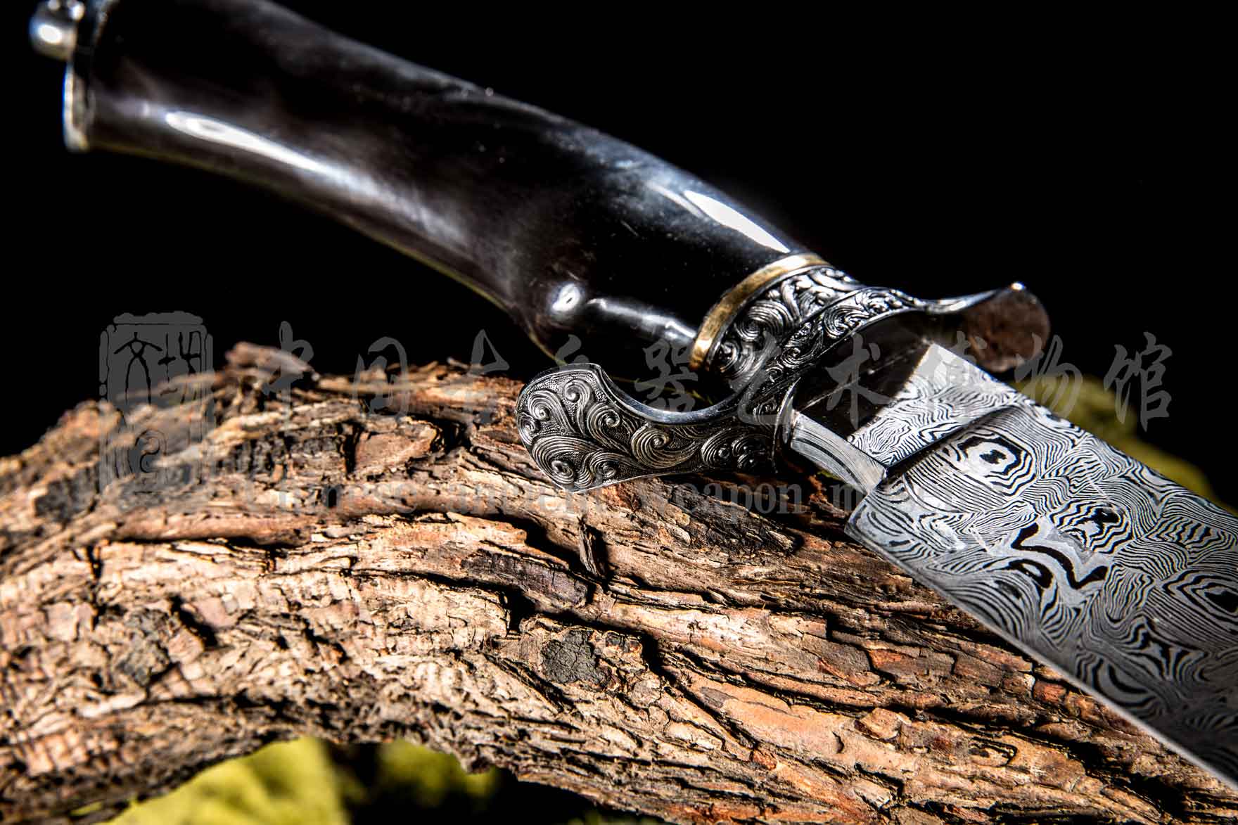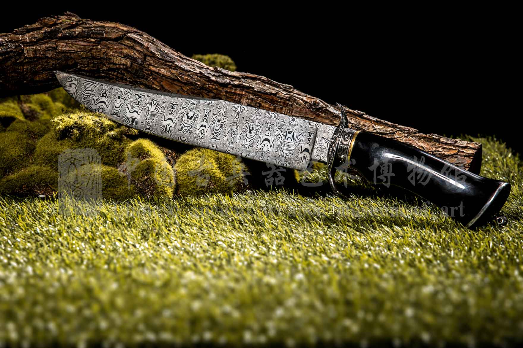 刀身材质为文涛坊自炼土钢与高碳钢,两种钢材巧妙折叠,四面不同锻打法。形成特别的花纹,如天猫、知了、蝙蝠等。体现极高锻造技艺,为此刀精华所在。运用现代热处理技术,硬度极佳。体现极高锻造技艺,乃此刀精华所在。