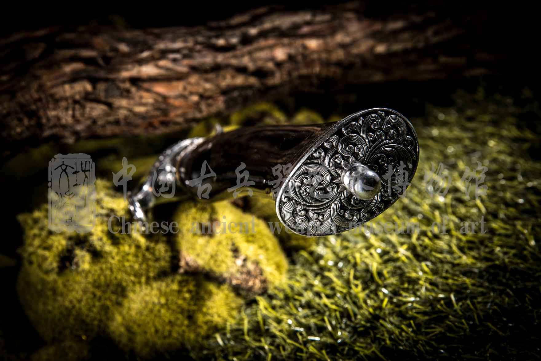 护手与柄尾材质为钢,手工制作成型后,铁浮雕卷草,耗时费工。卷草自然流畅,刀法娴熟生动。