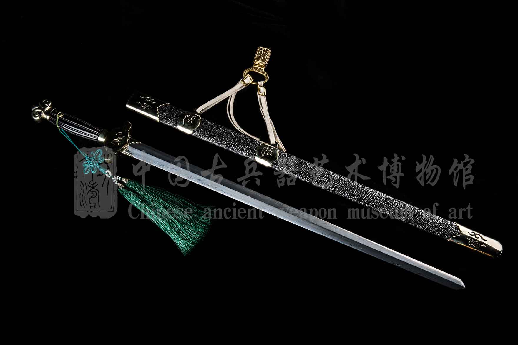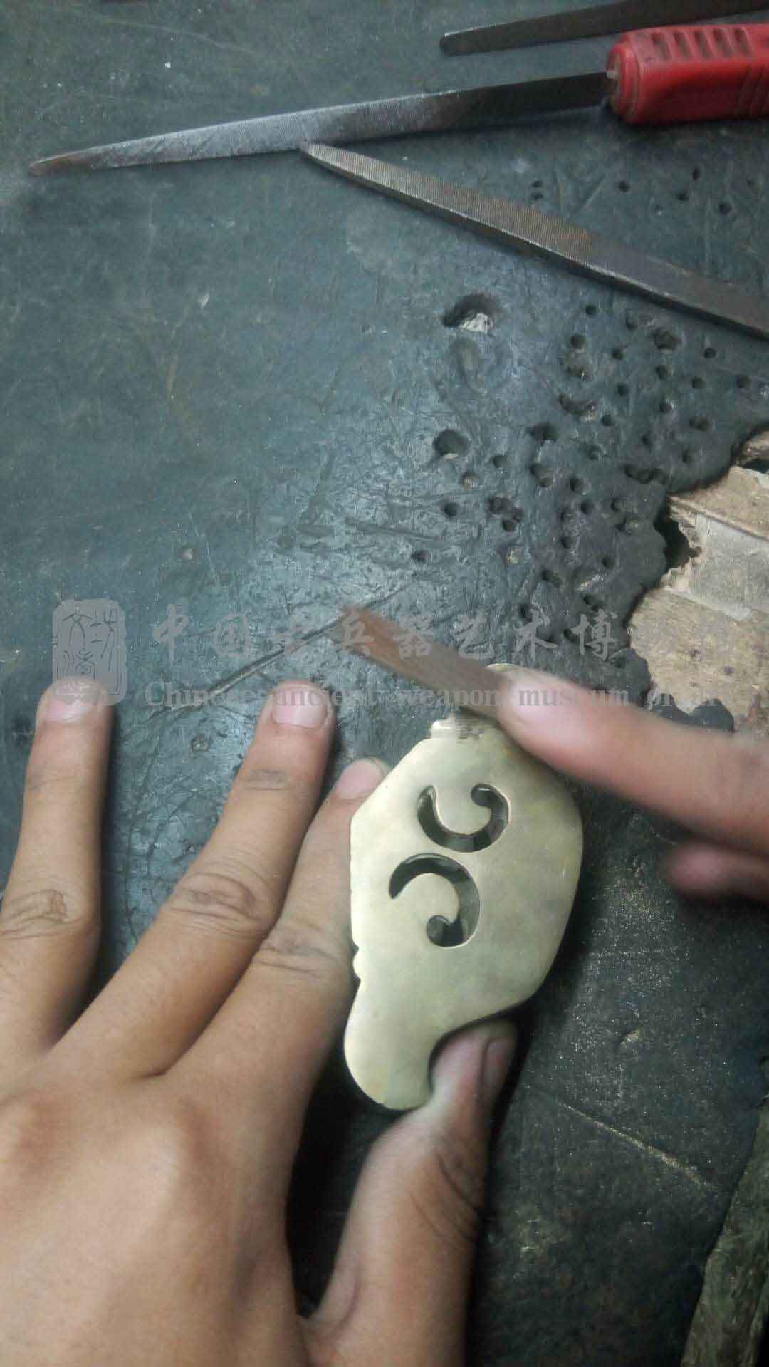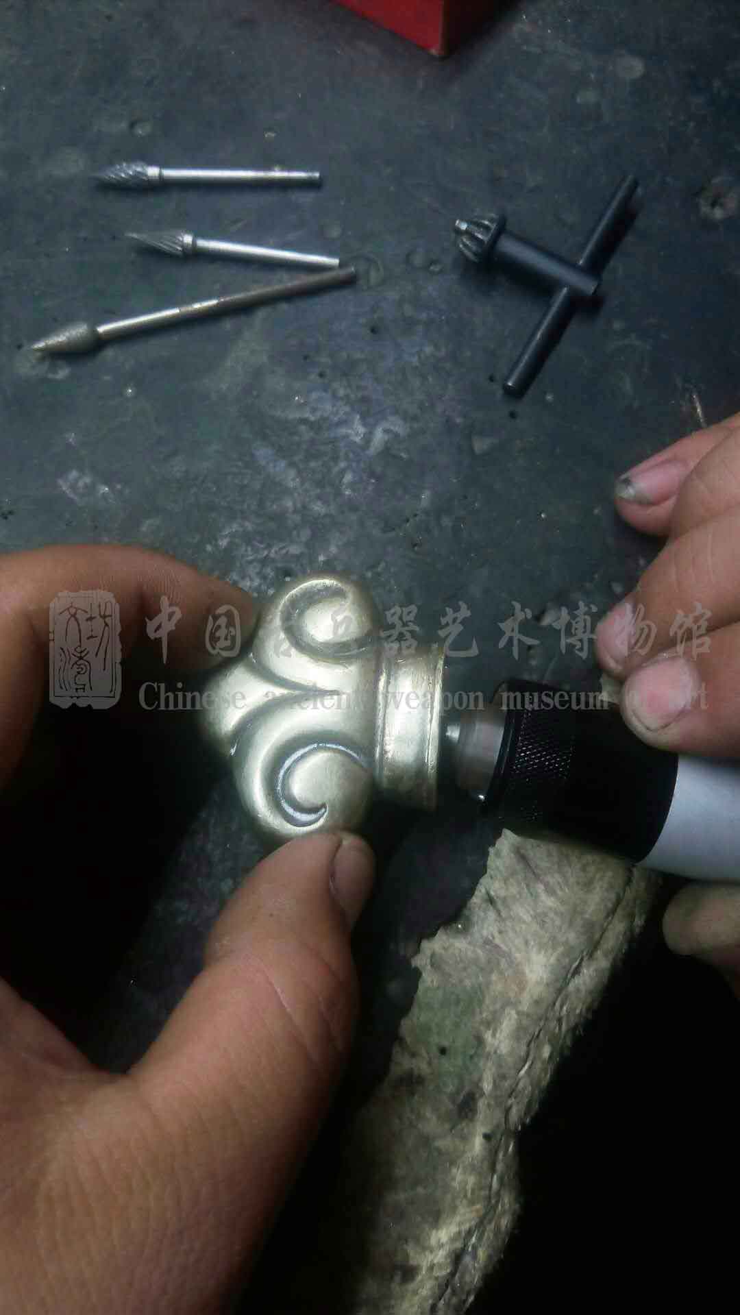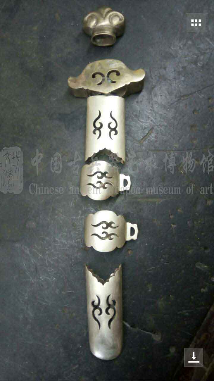 全装材质为白铜,经绘图、选材、手工成型、打磨做装,历时一月完工。柄首做如意型,代表事事如意。其余装具为镂空祥云,飘逸大气。