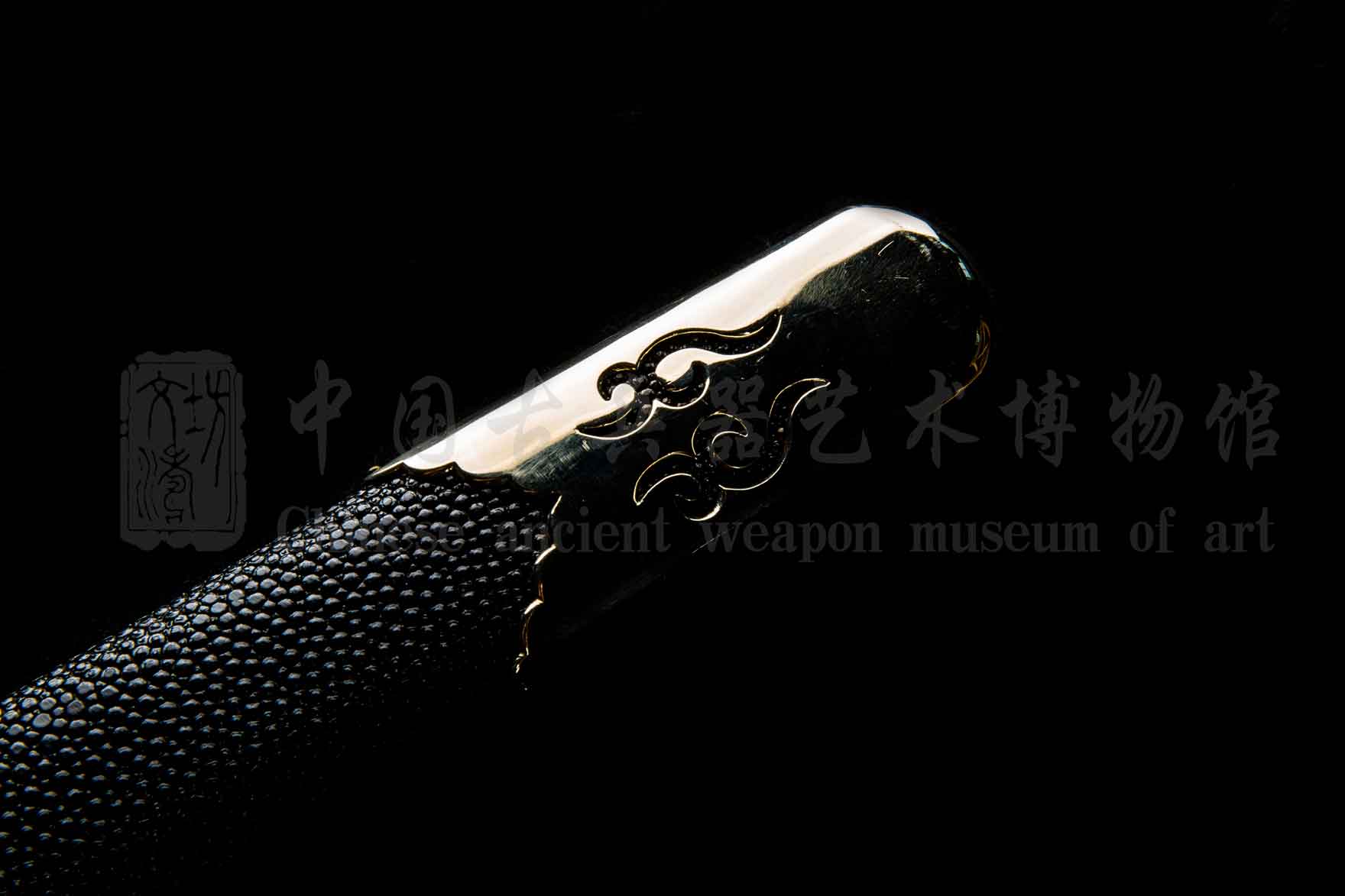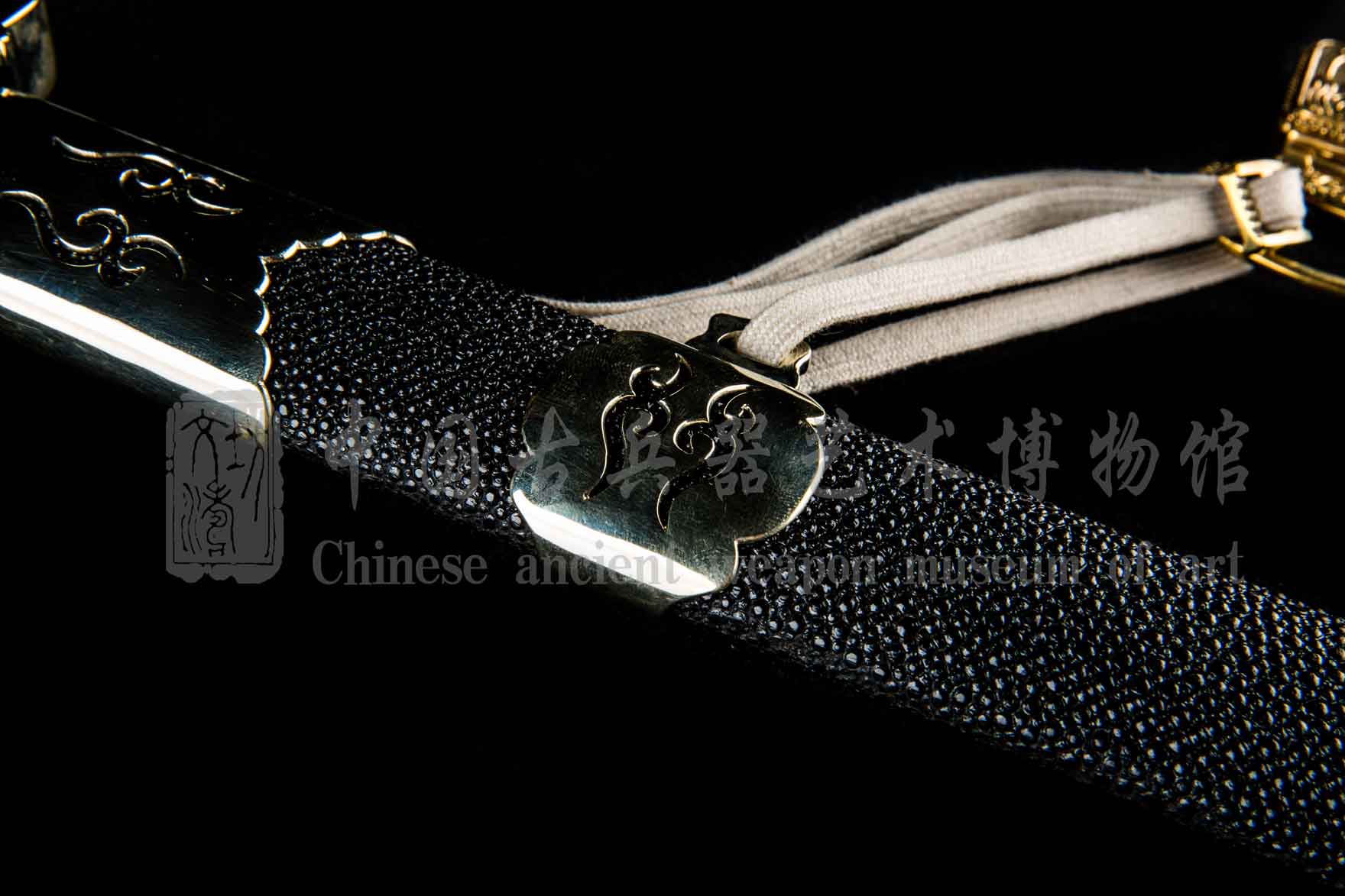 剑鞘软木外包颗粒珍珠鱼皮上黑色漆,大气厚重。手工粘合鱼皮,无缝对接。