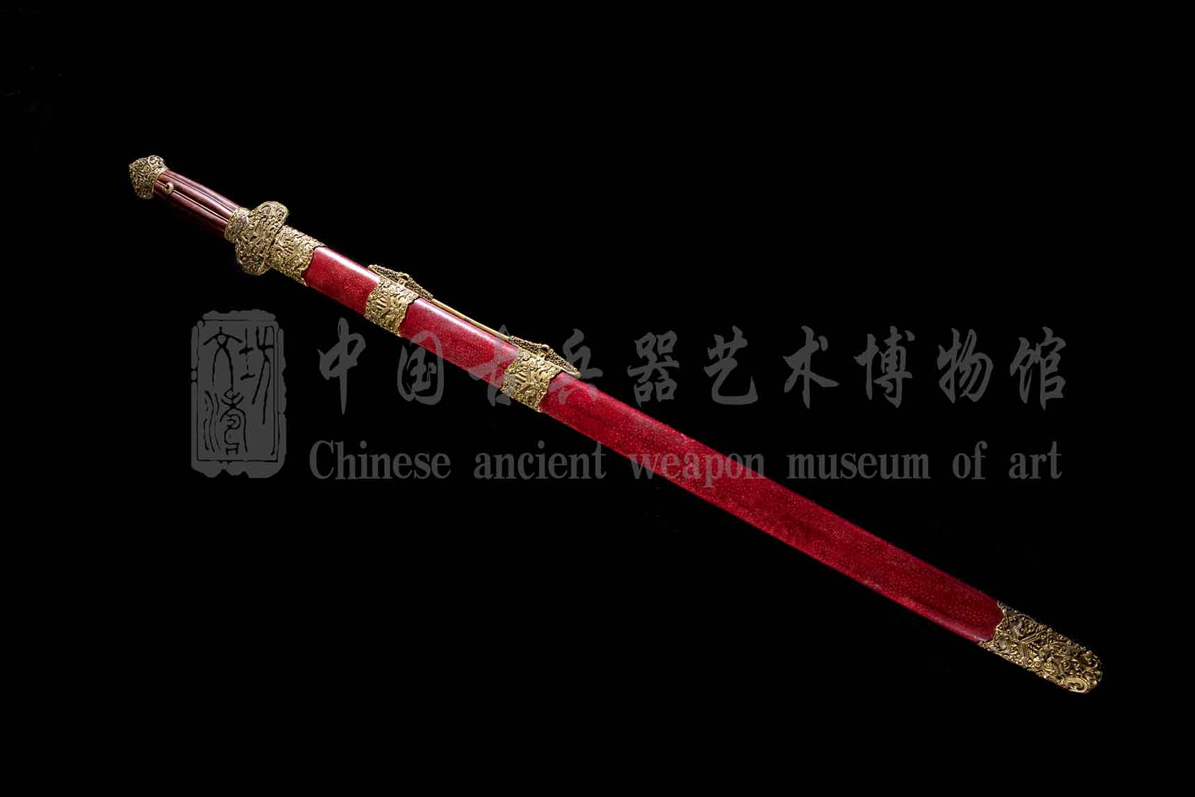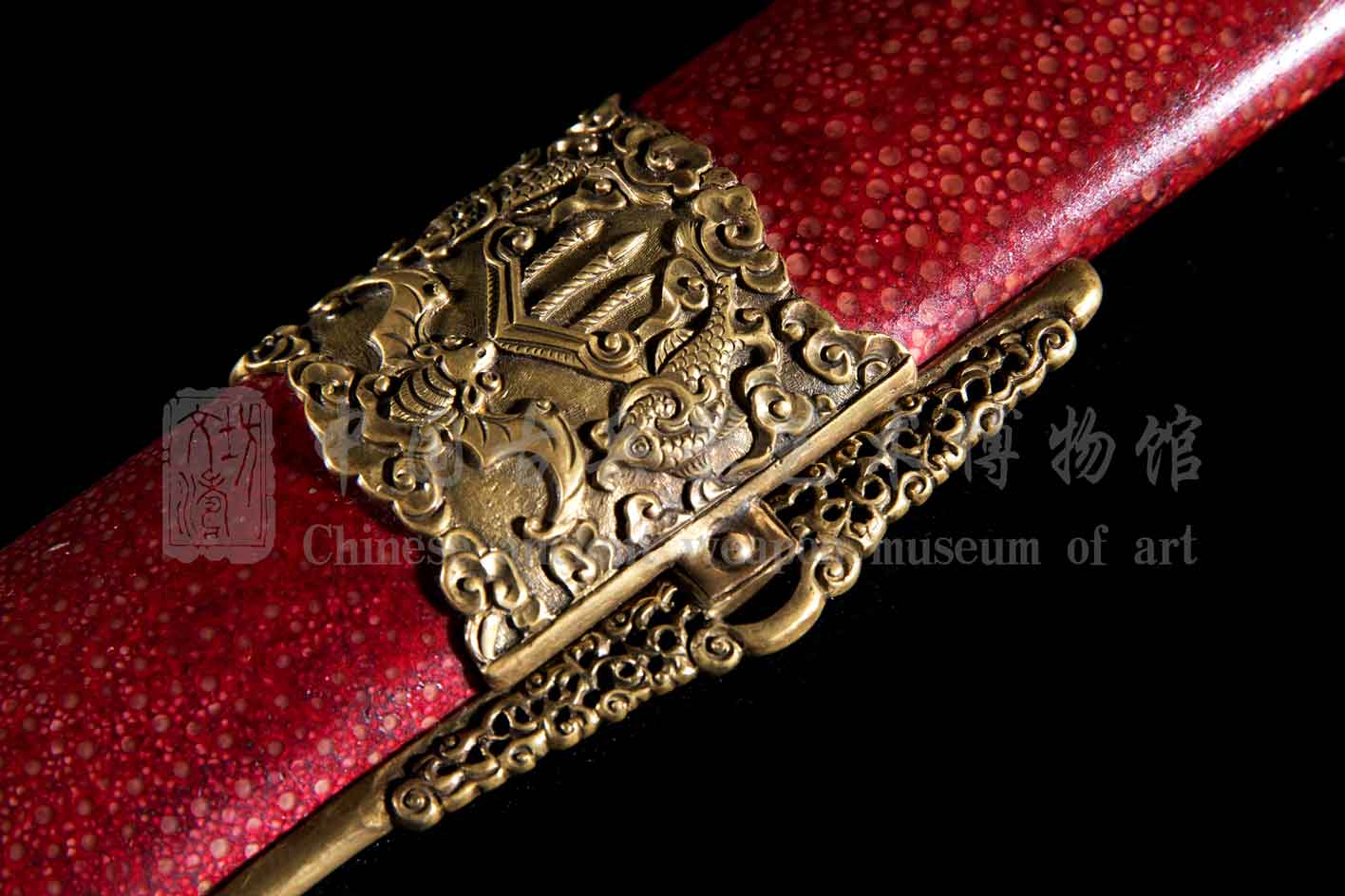 剑鞘软木外包珍珠鱼皮,上朱红漆,内涂朱砂,驱邪镇宅。红色做鞘,喜气满满。鱼皮结合处手工粘合,无缝对接,尽显精细。