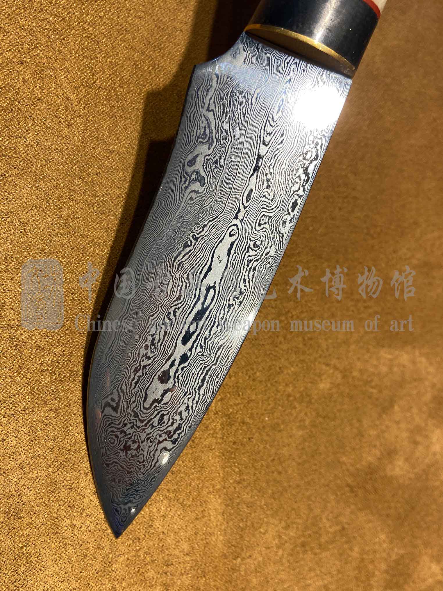 鹿角柄户外小猎刀由锻造技艺第六代传人、中国古兵器艺术博物馆馆长刘文涛老师,根据户外实用系列,设计、制作,历时近一月完工。刀身为文涛坊自炼钢材,手工折叠锻造而成花纹钢。刀身短小精悍,硬度极佳,适合户外削、切、砍等多种用途。经文涛坊研磨师手工研磨,耗时数十小时工作时间完成。花纹绚丽、刃部锋利。保证了美观并兼顾其实用性。手柄精选鹿角,人工打磨而成,手感舒适。手工做牛皮鞘,结实耐用、方便随身携带。