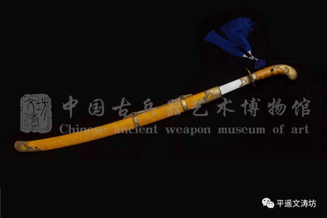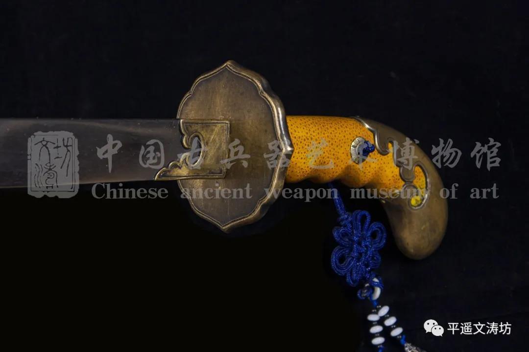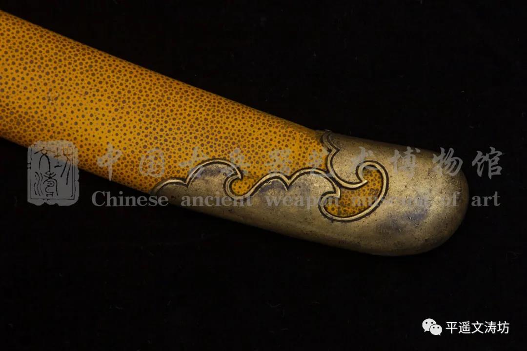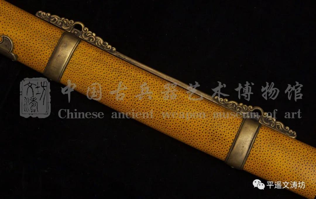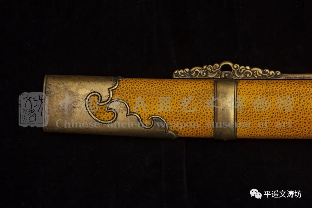 刀鞘软木外包珍珠鱼皮上明黄色漆,鱼皮颗粒无缝拼接而成,色泽明亮,具有皇室风范。为一支苍老的古刀更增添了一份明亮。