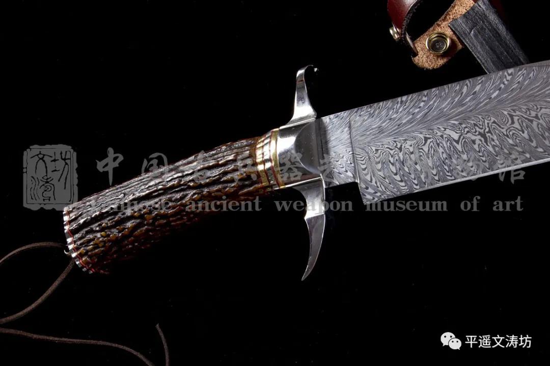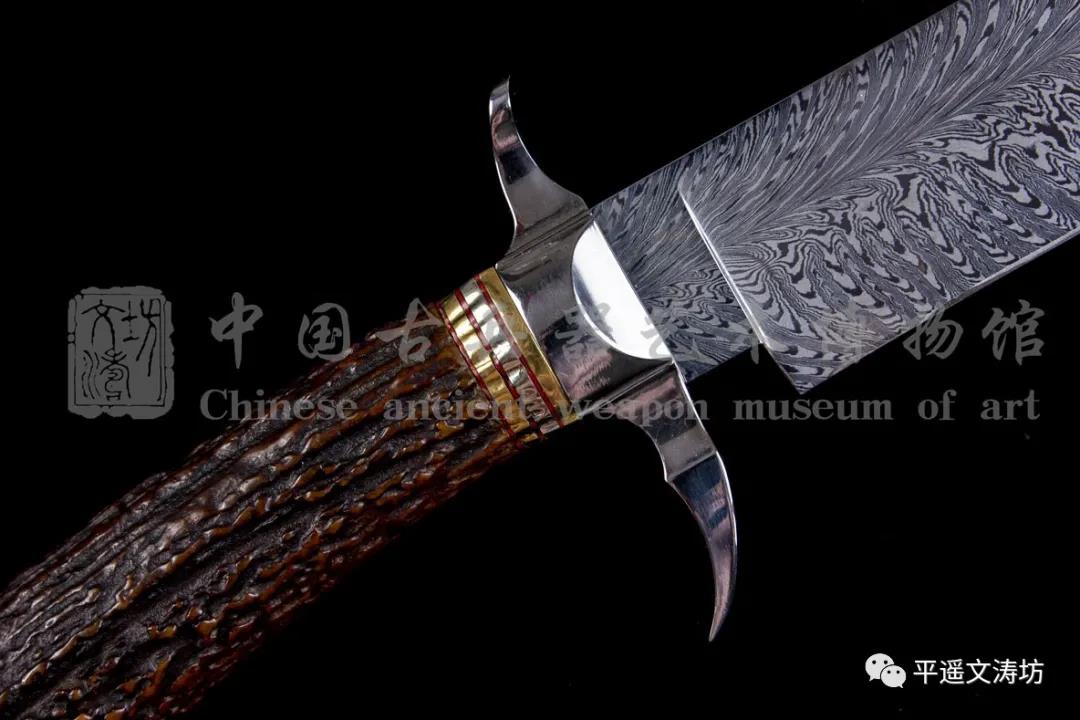 刀身:文涛坊采用传统锻造技艺与探索研发新型材料相结合,历时数年之久探秘的最新材质的花纹钢,花纹为手工折叠锻打而成羽毛纹。花纹自刀身中央向两侧绽放,自然绚丽,如手绘于刀刃,体现极高锻造技艺。花纹可与享誉世界的大马士革钢的极品纹饰相媲美,体现文涛坊不忘初衷、勇于进取的匠人精神。