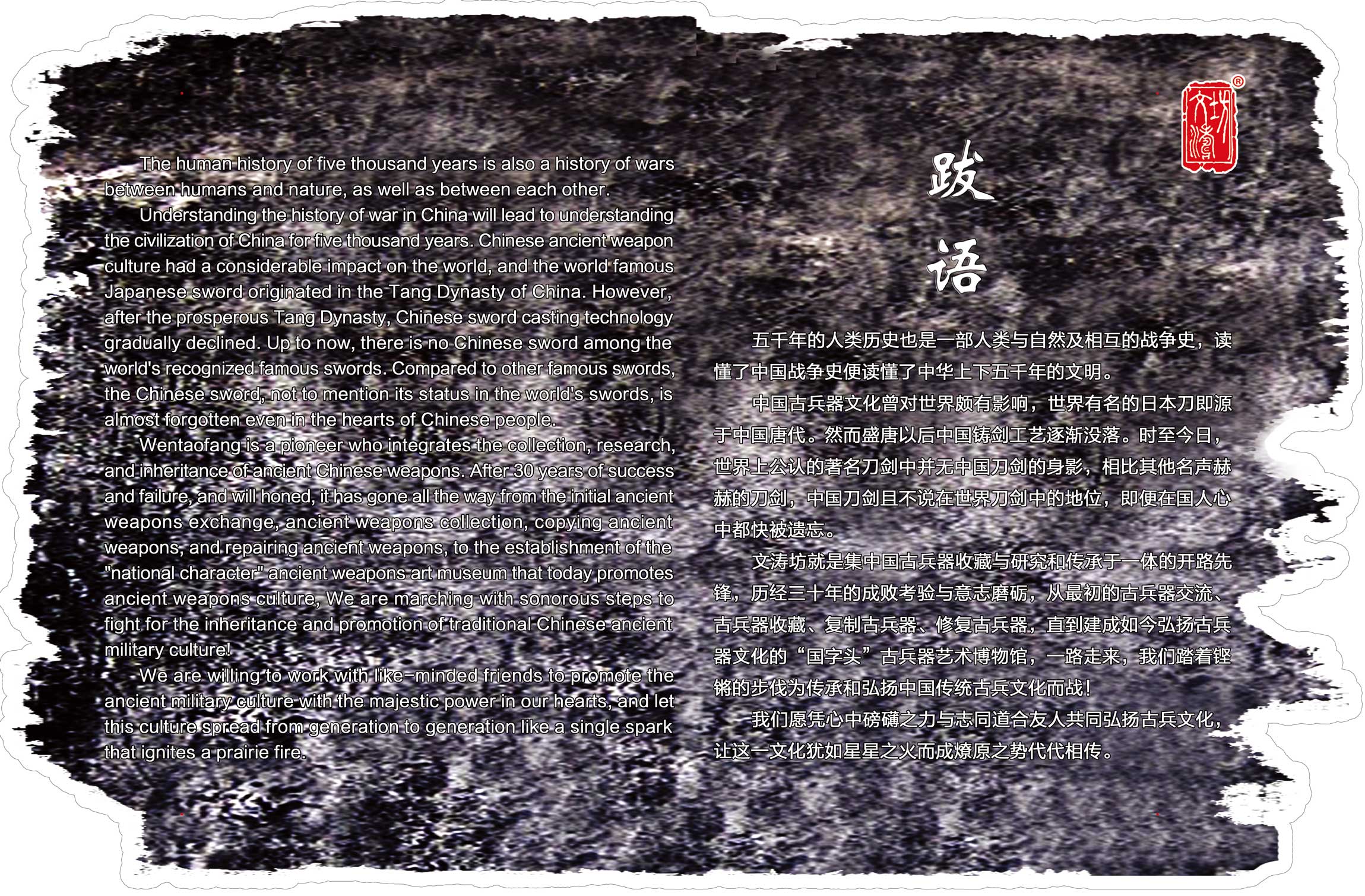In the 5 workshops of the Museum, our craftsmen display the entire process of making ancient weaponry, including: smelting, forging, grinding and carving. This is a demonstration of the Wentao workshop’s passion for ancient weaponry history and traditional Chinese culture.