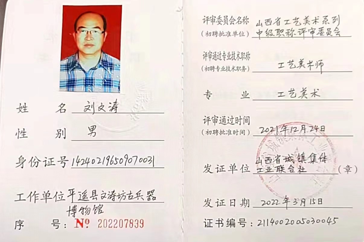 刘文涛,男,汉族,1965年9月7日生,大专学历,群众,文涛坊中国古兵器艺术博物馆馆长。中国工艺美术协会评审委员会委员、2022年冬奥会值日生、中共山西省省委党史特邀研究员,山西省文化遗产杰出传承人、山西省文联委员、山西省工艺美术大师、山西省“五一”劳动奖章获得者、山西中华文化促进会理事、晋中工匠、晋中市政协委员、晋中市民协副主席、平遥县政协常委,县委联系专家。
