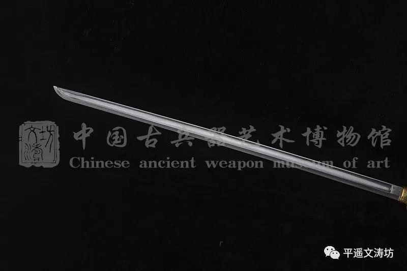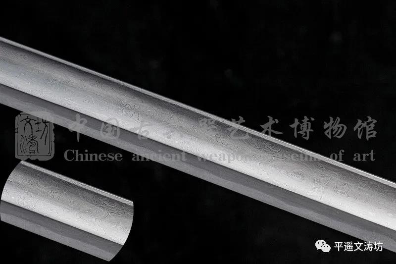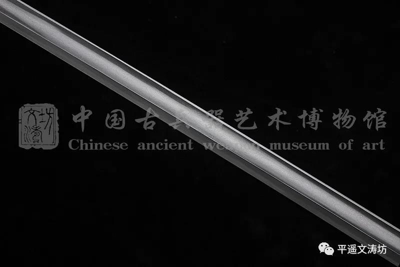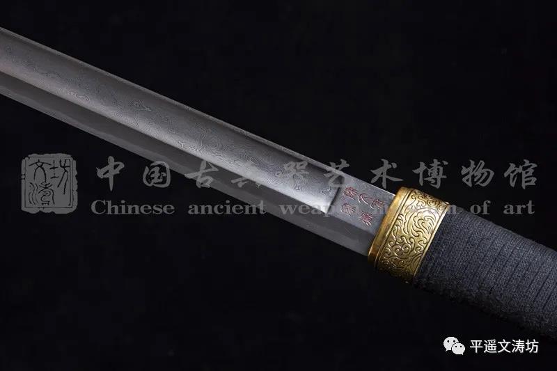 刀姿整体呈内弧形、刀背厚实,适于双手持握劈砍。刀身材质根据馆藏汉刀标本金属分析后,选取汉代五件残剑及文涛坊自炼碳钢等贵金属沿用古法折叠锻打,子夜淬火后回火冷锻,刃部夹钢,硬度极佳。