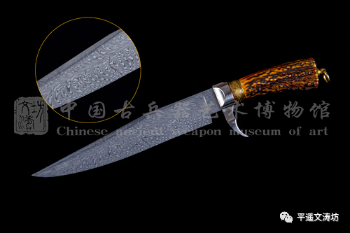 刀身:文涛坊采用传统锻造技艺与探索研发新型材料相结合,历时数十年之久探秘的最新材质的花纹钢,花纹为手工折叠锻打而成天梯。花纹自刀身中央向两侧绽放,自然绚丽,如手绘于刀刃,体现极高锻造技艺。刀背厚实,子夜淬火,硬度极佳。