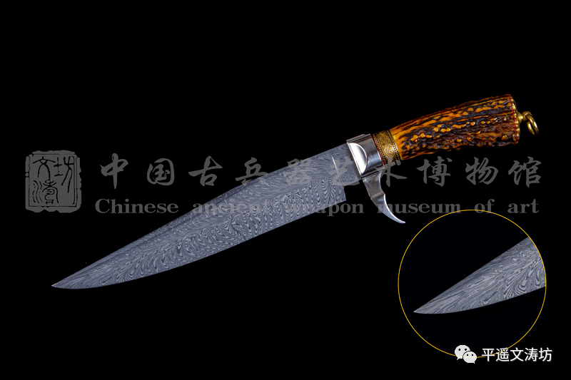 研磨:经文涛坊顶级研师,历经十七道工序、用时80个工作时间。经过整型、粗磨、细磨到精磨一气呵成。花纹色泽明亮,对比度极高,如羽毛,跃然于刃。完美的锻造由高超的研磨技艺充分体现。花纹可与享誉世界的大马士革钢的极品纹饰相媲美,体现文涛坊不忘初衷、勇于进取的匠人精神。
