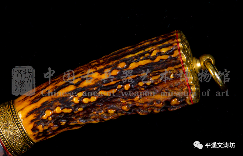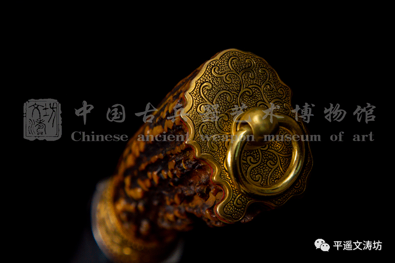 柄环与柄尾为黄铜阴刻卷草,手工雕刻,线条流畅,动感细腻。