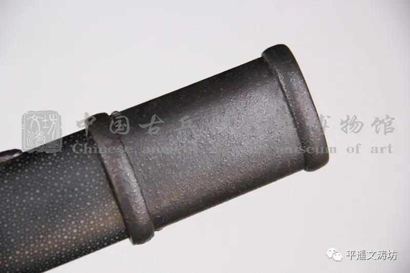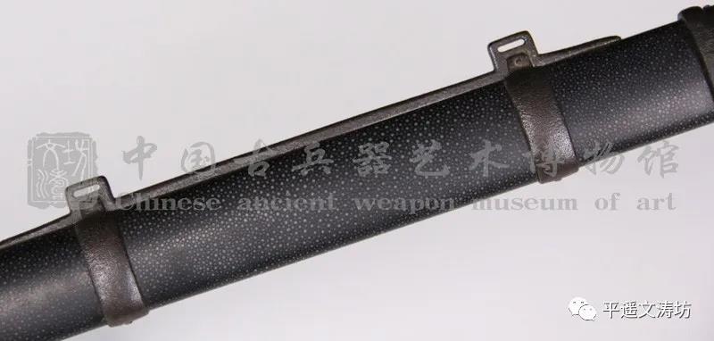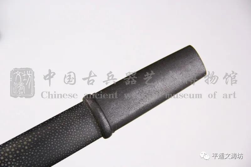 剑鞘为硬木外包珍珠鱼皮上黑漆,反复手工打磨剑鞘。黑色厚重,给人大气庄重之感。鱼皮颗粒,手工无缝拼接,浑然一体。