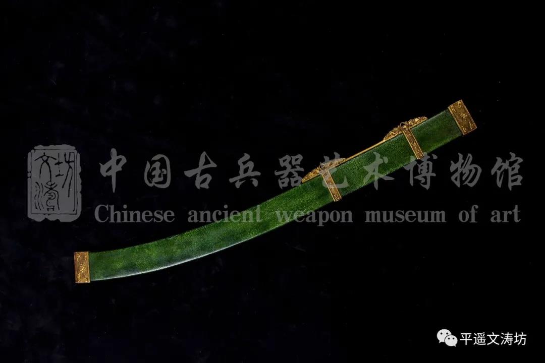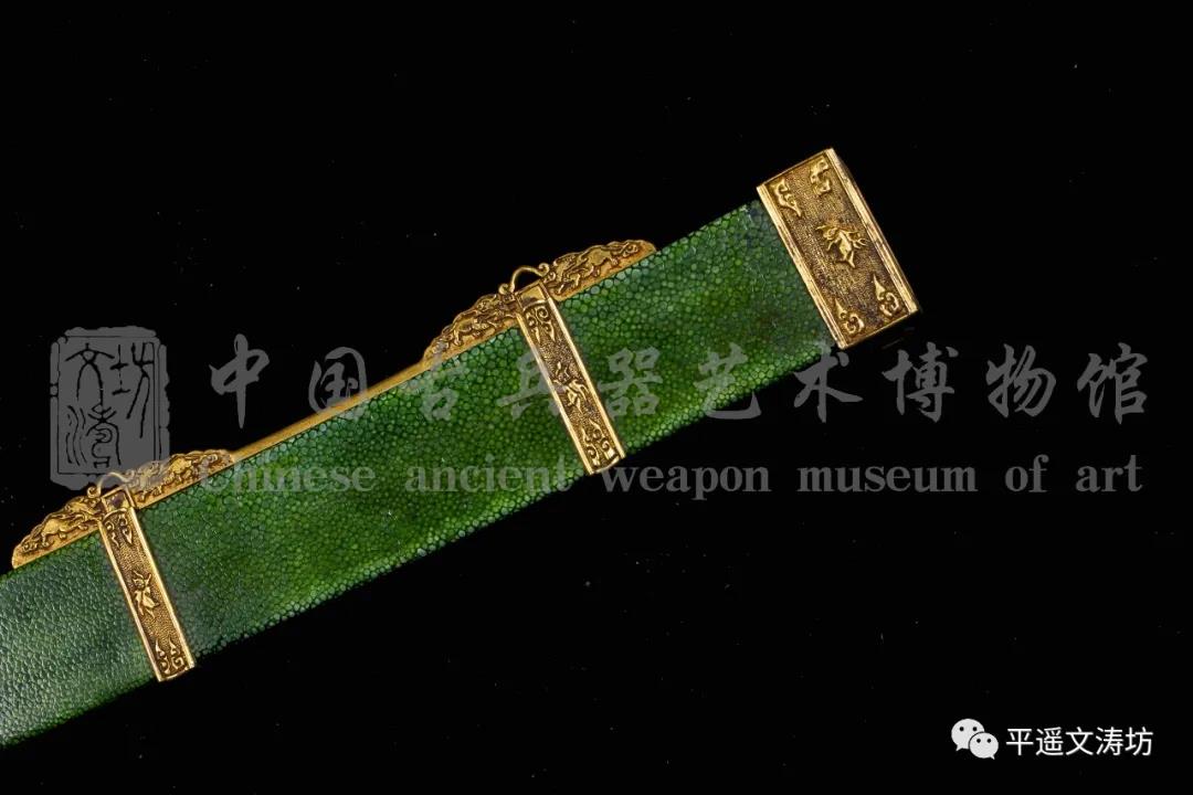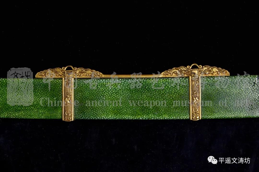 刀鞘内衬软木外包珍珠鱼皮上墨绿色漆,鱼皮接头处无缝拼接而成。铁雕祥云瑞兽官配刀手感极佳。是收藏、把玩、馈赠的超值首选之佳作!