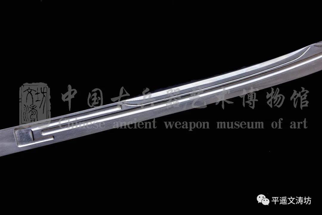 刀身开刀槽本来不易,做成美观大气的更为难得。这支刀的刀根处为一个回型槽,开槽面积大、底部平整,制作工艺难度极大。此外,还有三处刀槽制作起来难度也并不小。正是这几处刀槽,让这支刀显得更加大气、威武。