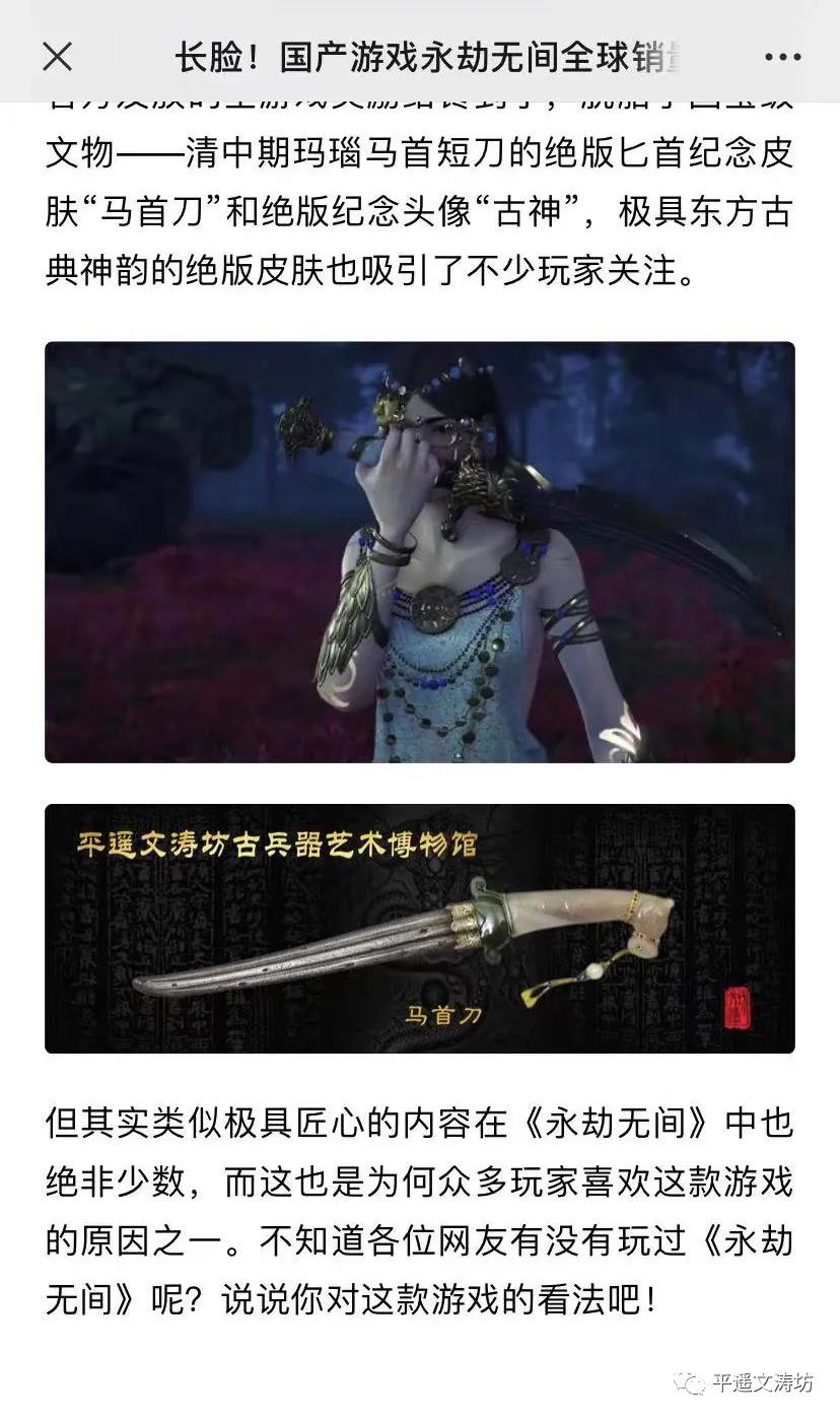 11月文涛坊与《永劫无间》团队经过磋商,将中国古兵器艺术博物馆馆藏的镇馆之宝之一马首刀,授权12个月给《永劫无间》团队,作为皮肤正式上线,赠送给亿万粉丝。