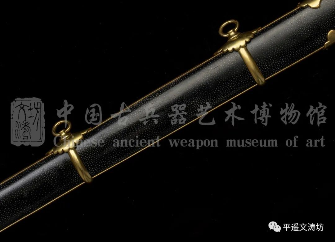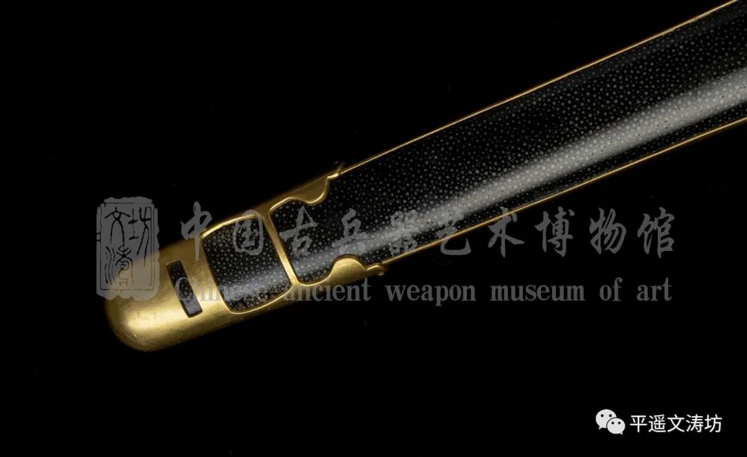 剑鞘硬木外包珍珠鱼皮上朱黑色大漆,鱼皮接头处手工手工拼接而成,严丝合缝,浑然一体。