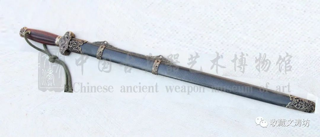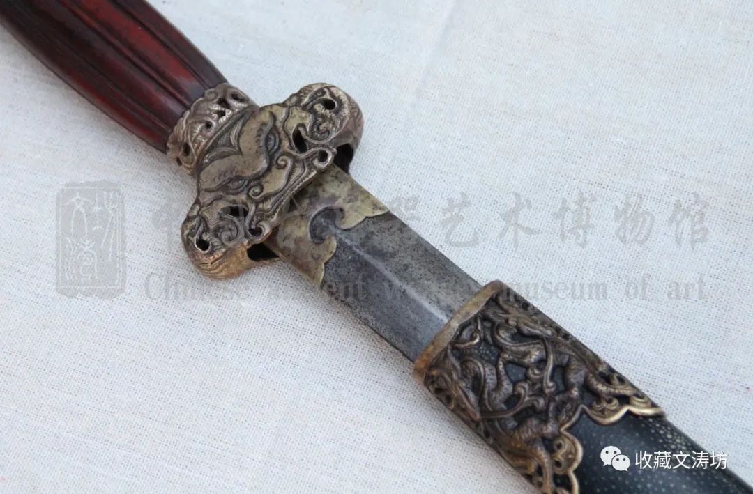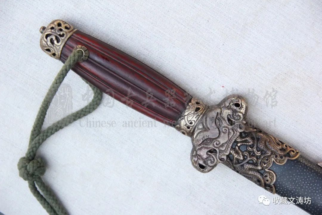 剑装的材质为黄铜,镂空精雕草龙,雕刻完成做旧。