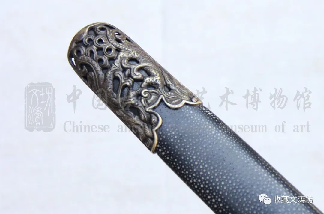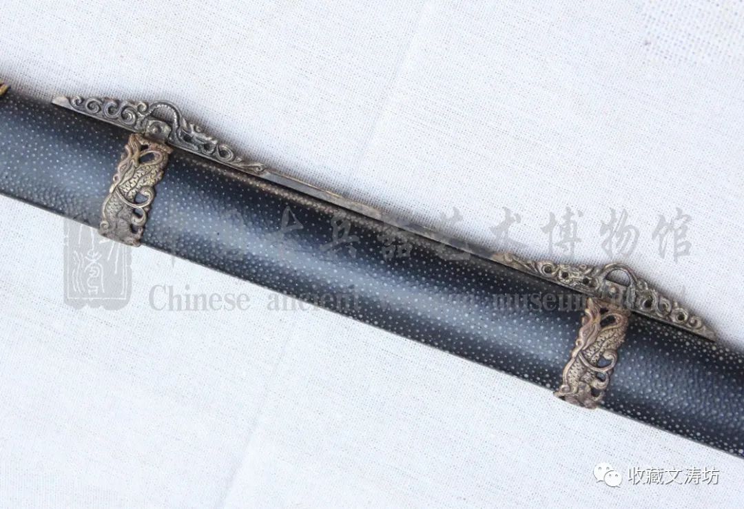 剑剑鞘的材质选用优质珍珠鱼皮,黑漆与颗粒白的颜色形成撞色,让人眼前一亮。