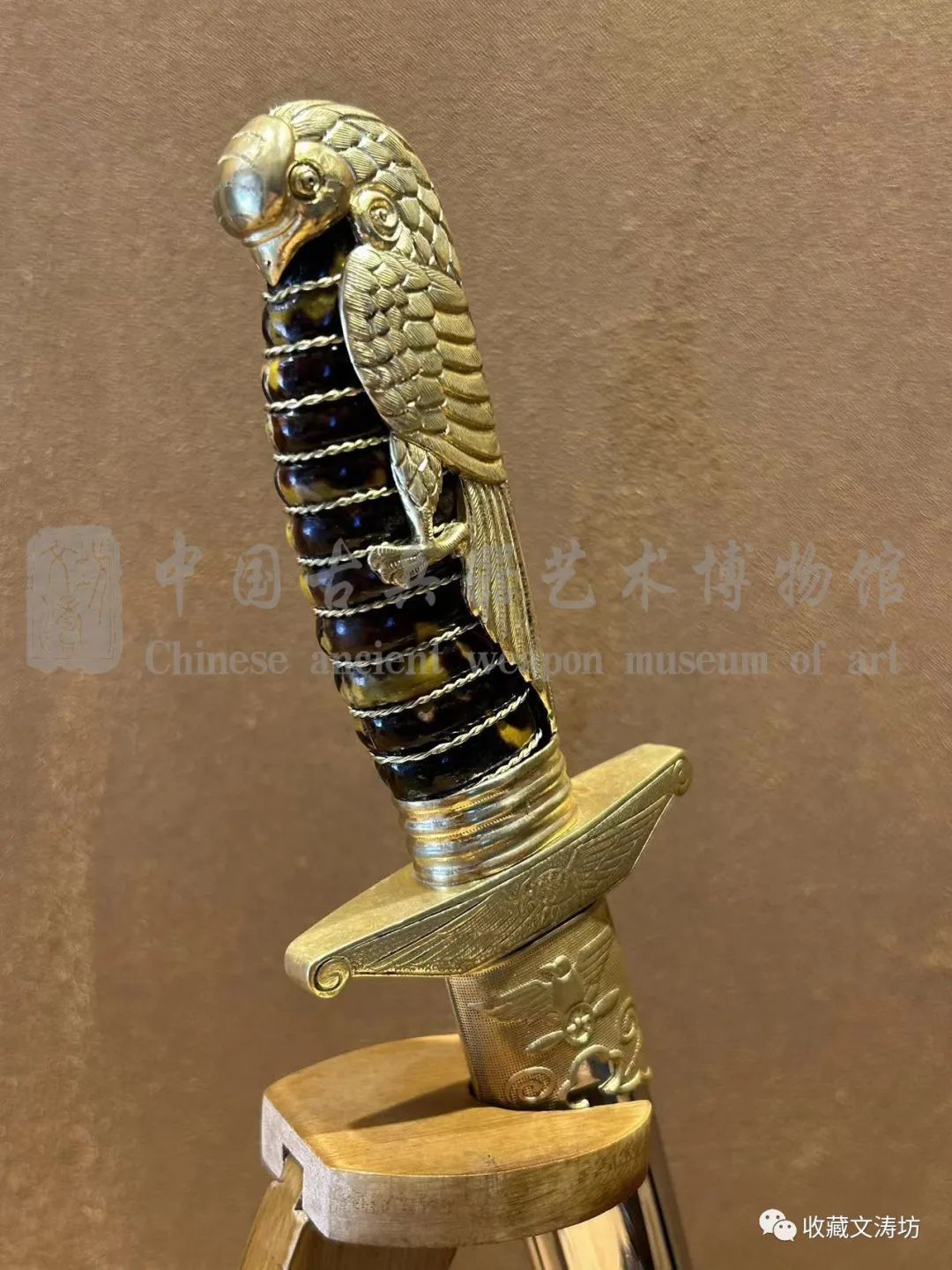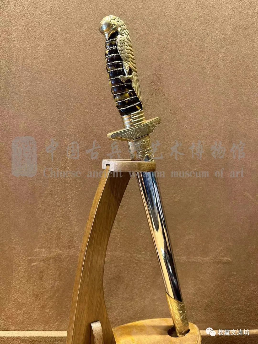 空军中正剑,是国民党专为空军飞行员度身定做的佩剑。为二战时期中国空军飞行员所佩戴的短剑。剑柄上有一只铜铸的鹰,整把鹦鹉剑粗看像鹦鹉,因此为“鹦鹉剑”,取“英武”二字谐音。 空军鹦鹉剑最大特色,在于剑格处是双利鹰。双利鹰由黄铜制成,翅膀羽毛层次分明,鹰爪遒劲有力,非常出彩;鹰柄铸造成型后,经由手工打磨修整,每片羽毛上的织细发丝都表露无遗。