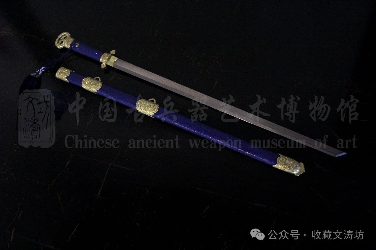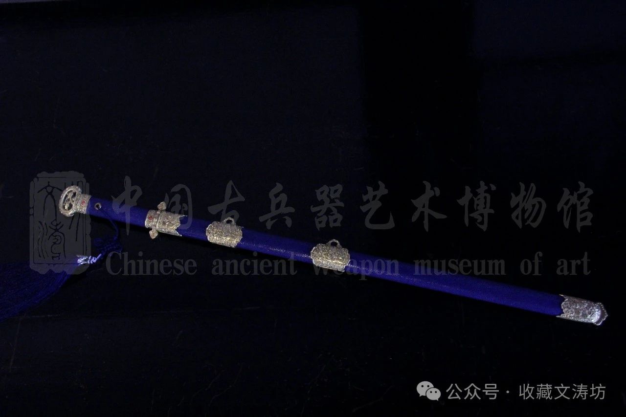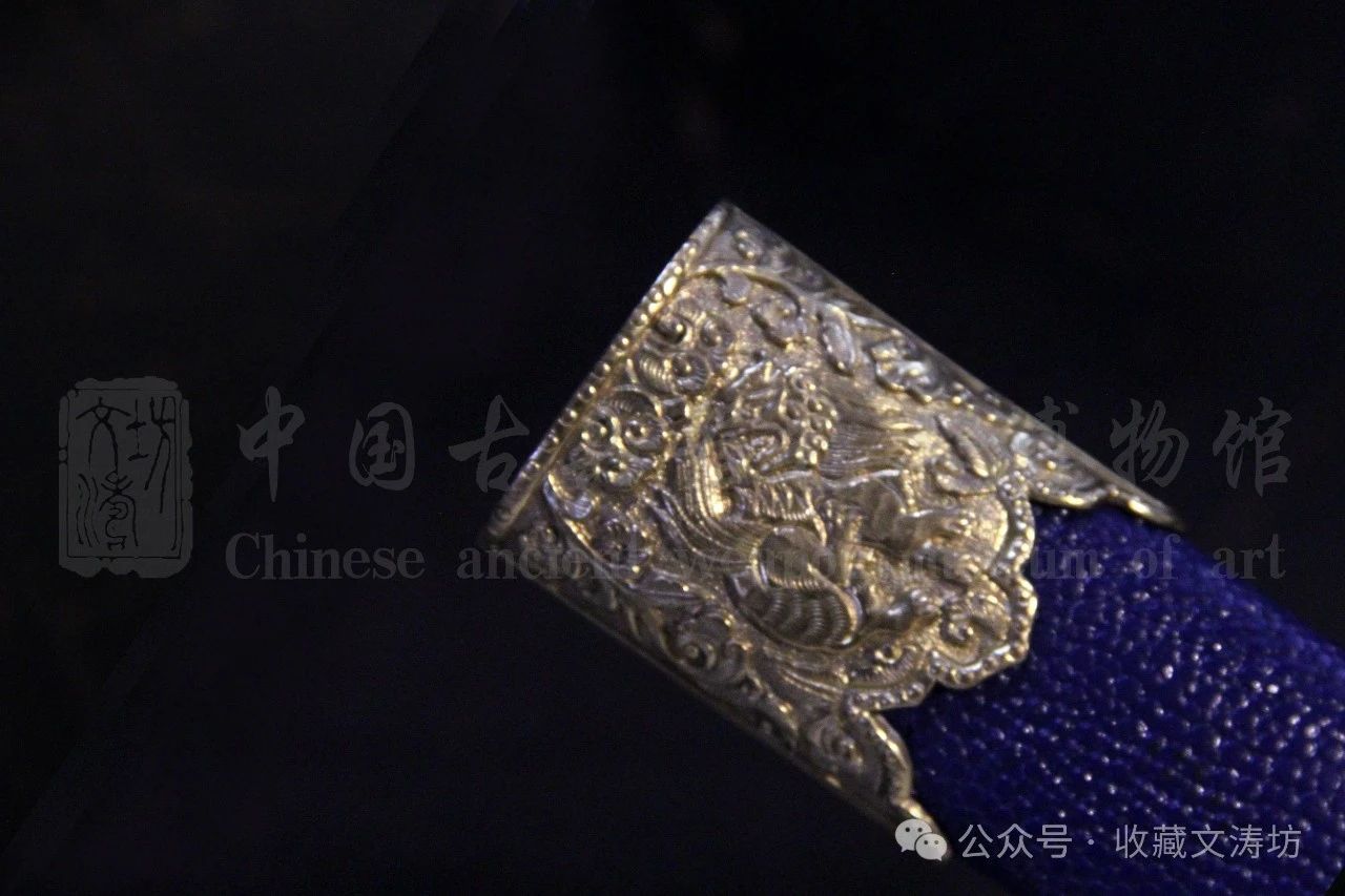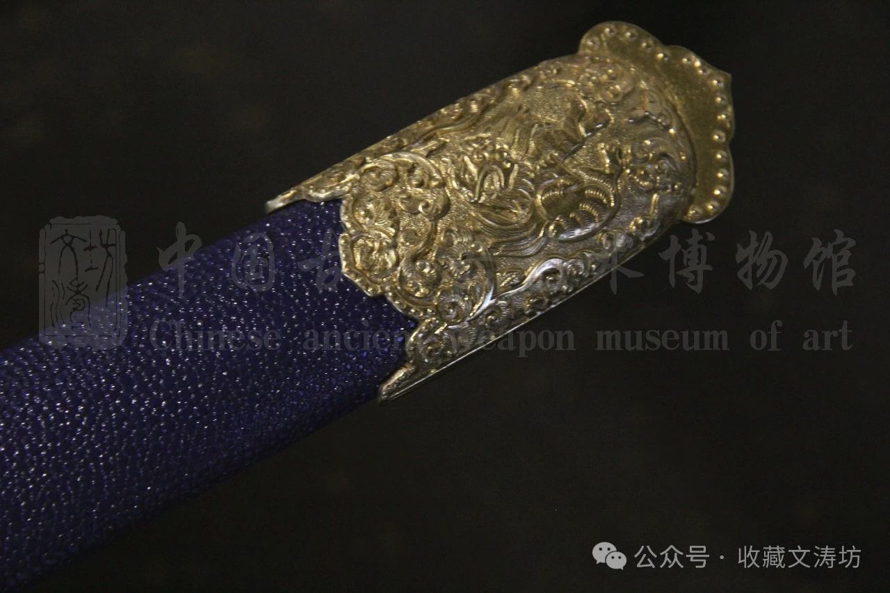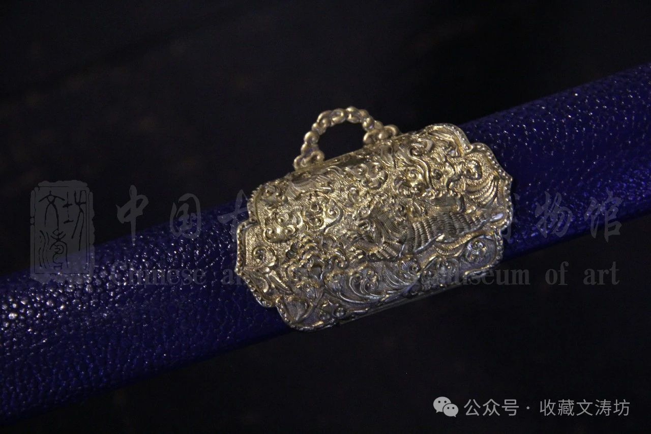 刀鞘软木外包珍珠鱼皮,上宝蓝色漆。色泽艳丽,为原本庄重的唐刀添了一份俏皮与高级感。