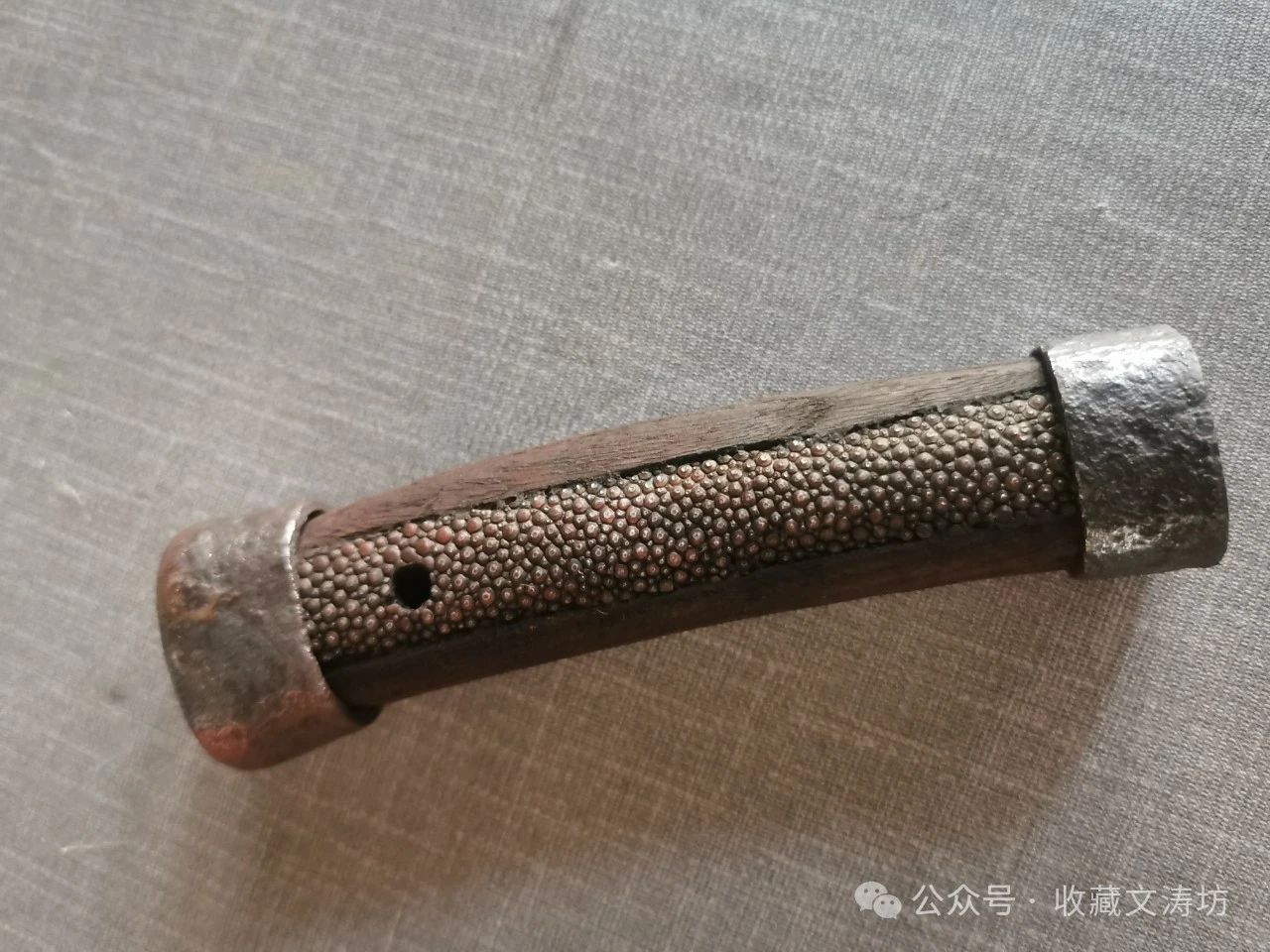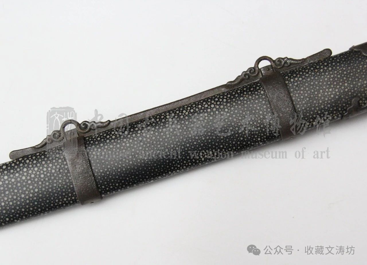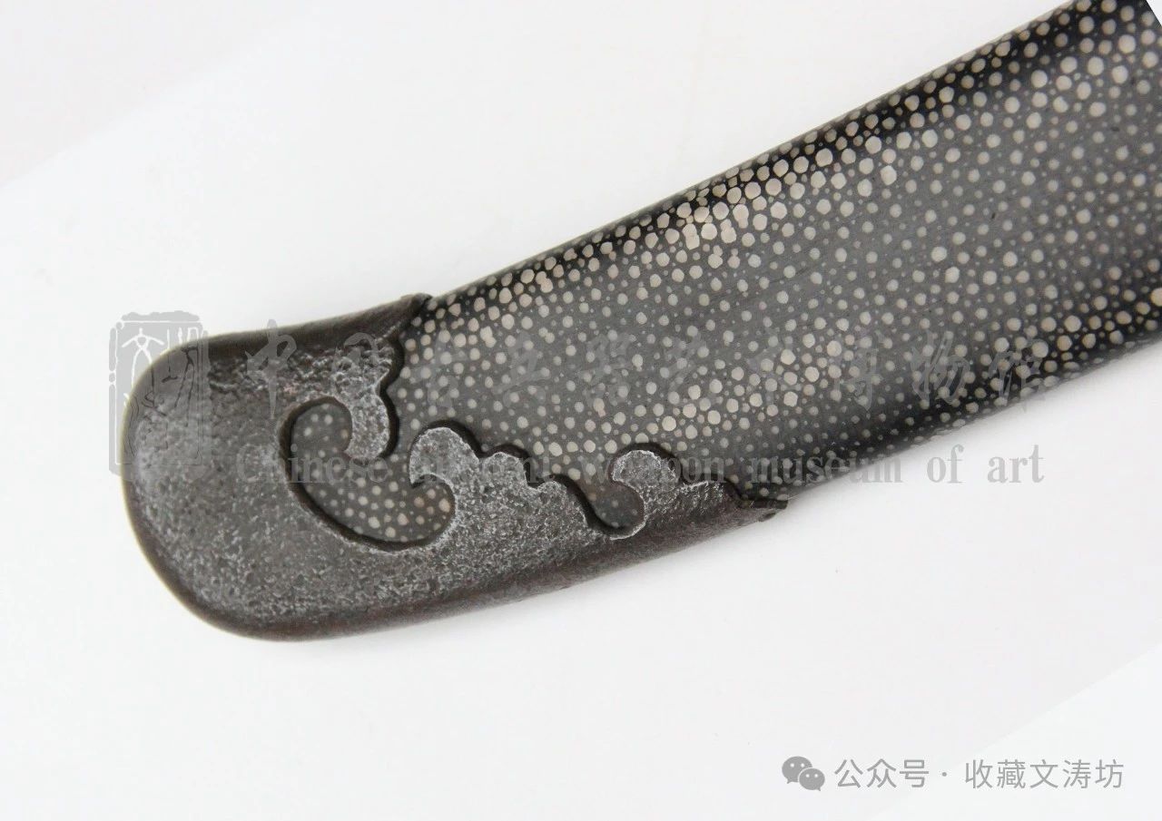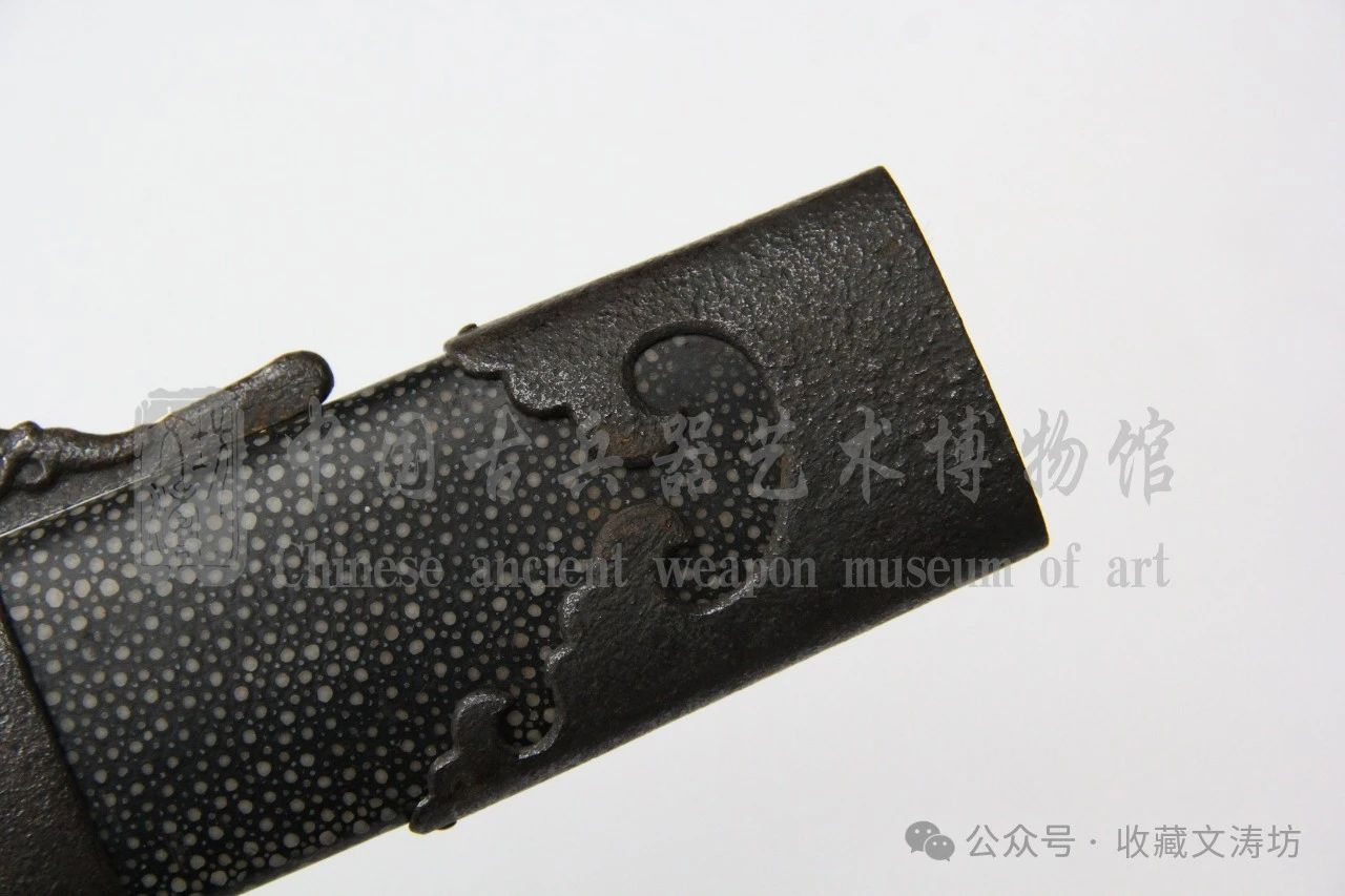 根据实际尺寸,进行量体裁衣,制作贴合的刀鞘,并包珍珠鱼皮上黑色漆。经反复打磨、上漆后,鱼皮露出珍珠底,非常漂亮。